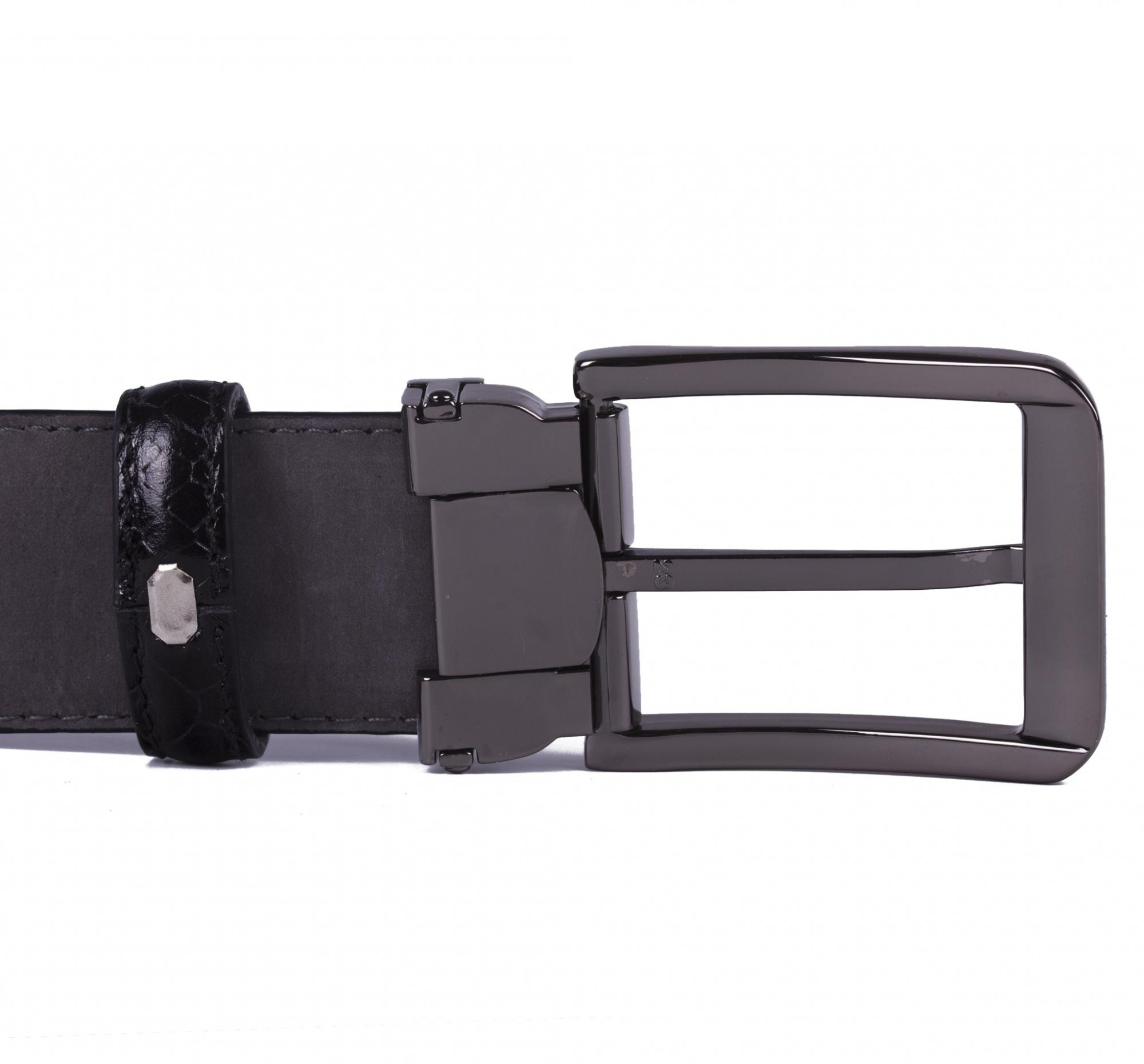 Двухсторонний стильный мужской ремень Vasheron выполнен из натуральной телячей кожи выделанной под змеиную кожу.