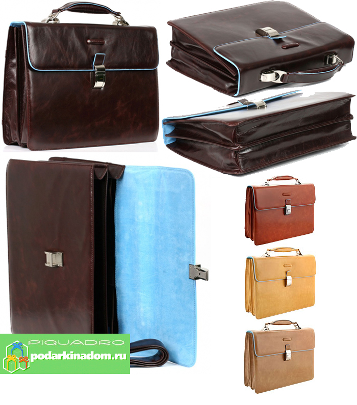 Портфель с одним замком из натуральной кожи. Оторочка по канту, подкладка - голубым. Отделение для ноутбука (13 дюймов) с фиксацией, съемные чехлы для кредитных карт, палма, ручек. Система крепления к ручке багажной сумки. Два основных отделения.