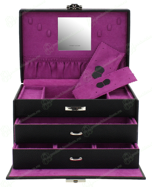 Презентабельная шкатулка для хранения украшений от немецких дизайнеров Champ Collection (Friedrich 23) 20041-2 из серии Modulo. Внешняя отделка шкатулки выполнена из черной экокожи. Внутренняя отделка завершена с применением фиолетового велюра. Произведено в Германии.