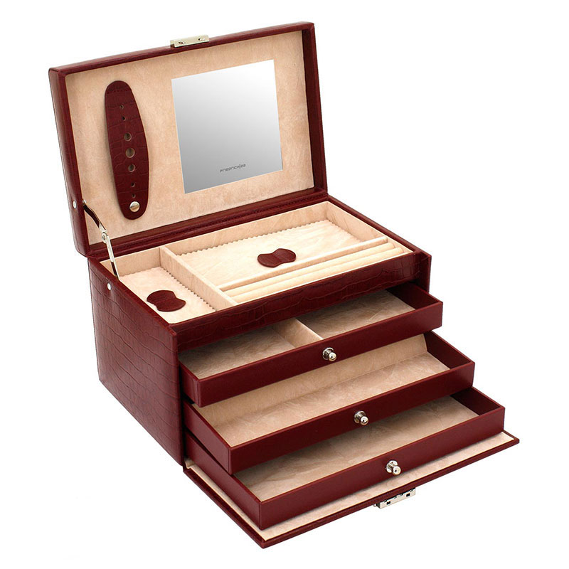 Внутри отделана мягкой бархатистой на ощупь тканью бежевого цвета. Внутри шкатулки расположены четыре просторных секции: три выдвижных ящичка - универсальные, верхнее отделение содержит одну секцию для колец и два универсальных отделения, оснащенных оберегающими подушечками. С внутренней стороны верхней крышки расположено крепление для запонок или серег и зеркало. Шкатулка закрывается на надежный замок. Удобная ручка для переноски. При уходе за изделием рекомендуется использовать влажную тряпочку.