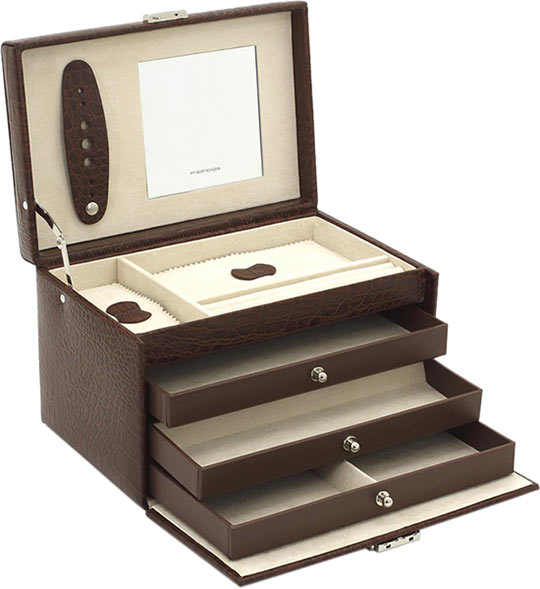 Шкатулка для украшений. Внутри: на верхней полке 2 отделения и валики для колец. 3 выдвижных ящика, нижний и средний разделены на 2 отделения каждый. На крышке с внутренней стороны зеркало и крепления для серьг. Внутренняя отделка - серый велюр. Закрывается на ключ.