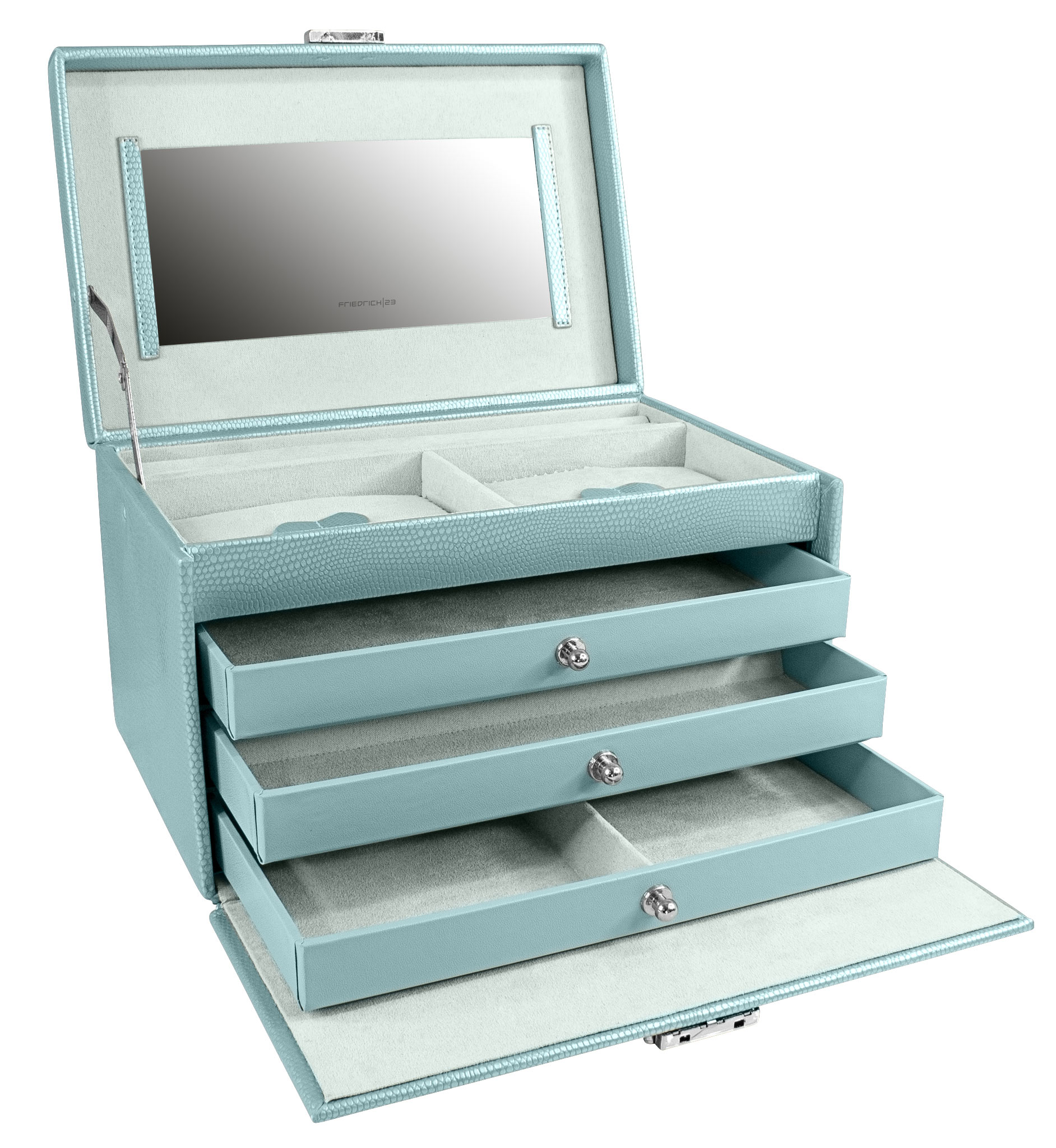 Шкатулка изготовлена из высококачественной экокожи голубого цвета с тиснением "ящерица". Внутренняя отделка выполнена из велюра белого цвета. Шкатулка состоит из множества отделений различных размеров, что позволяет аккуратно хранить Ваши украшения.