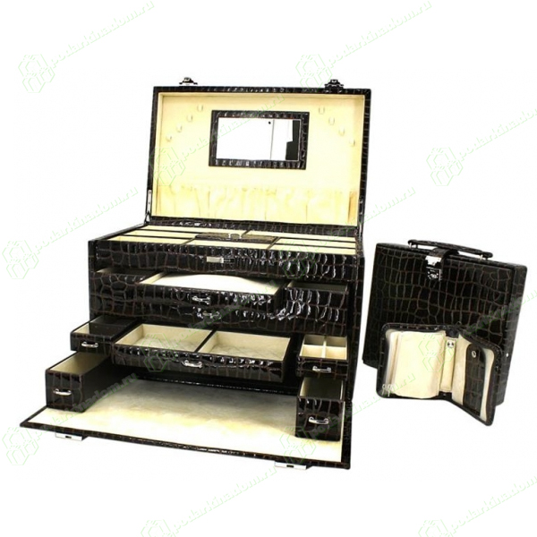 6 ящиков: 2 маленьких, 1 средний, 2 глубоких ящика с различными разбиениями. 1 большой ящик с отделением для колье и 4 часовыми подушками.
