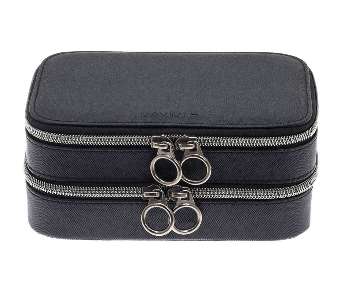 Выполнена из экокожи черного цвета с линейной фактурой. Внутренняя отделка завершена велюром светло-серого цвета. Верхний ярус футляра состоит из одного большого отделения, трех небольших отделений с перфорированными перегородками для крепления серег, четырех крючков для подвешивания цепочек и одного кармана на резинке. Нижний ярус футляра состоит из четырех средних отделений, одного большого отделения с ювелирными валиками для хранения колец и удобного откидного зеркала. Оба отделения закрываются на молнию.
