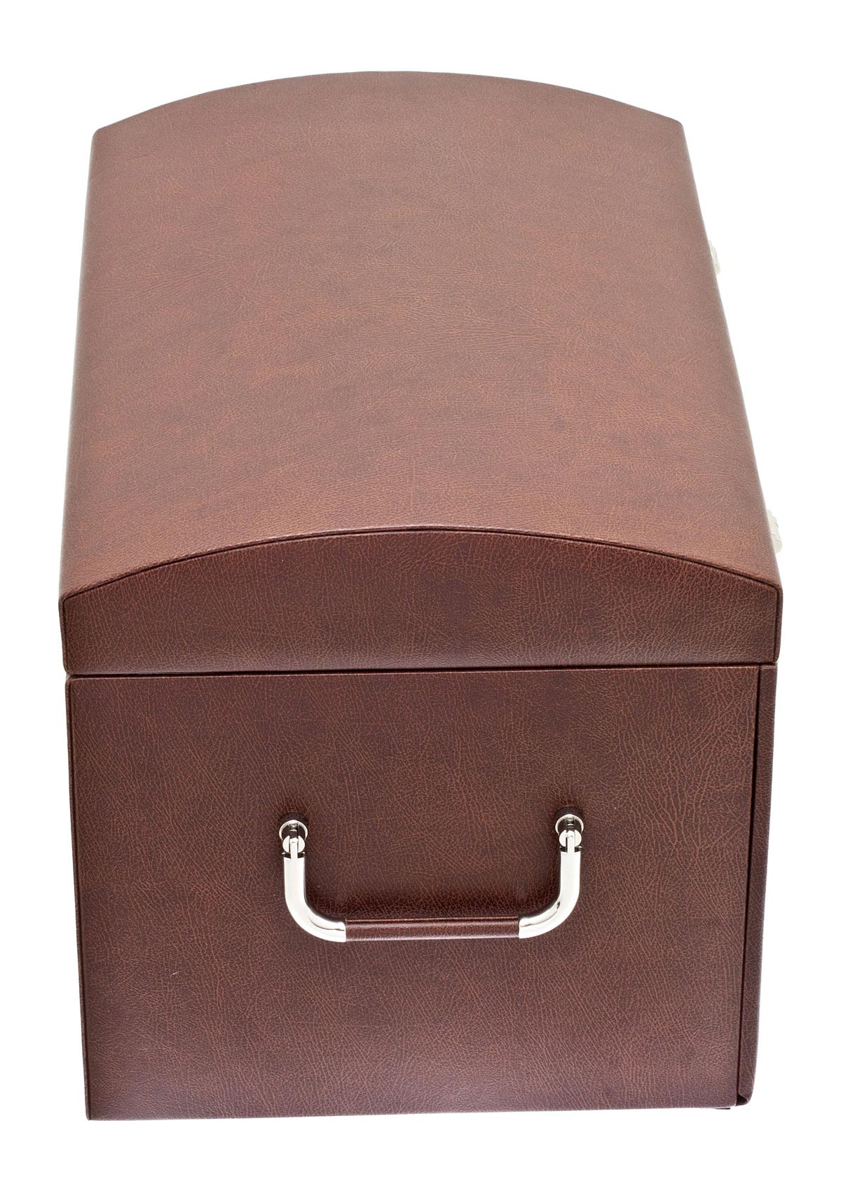 Шкатулка изготовлена из высококачественной экокожи темно-коричневого цвета. Внутренняя отделка выполнена из велюра бежевого цвета.