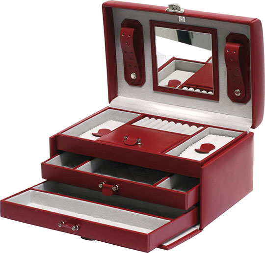 Шкатулка для удобного хранения украшений. Внутри: 2 выдвижных отсека, отделения для украшений и держатели для колец. На верхней крышке зеркало и крепление для серег и цепочек. Внутренняя отделка - полиэстер. Закрывается на ключ.