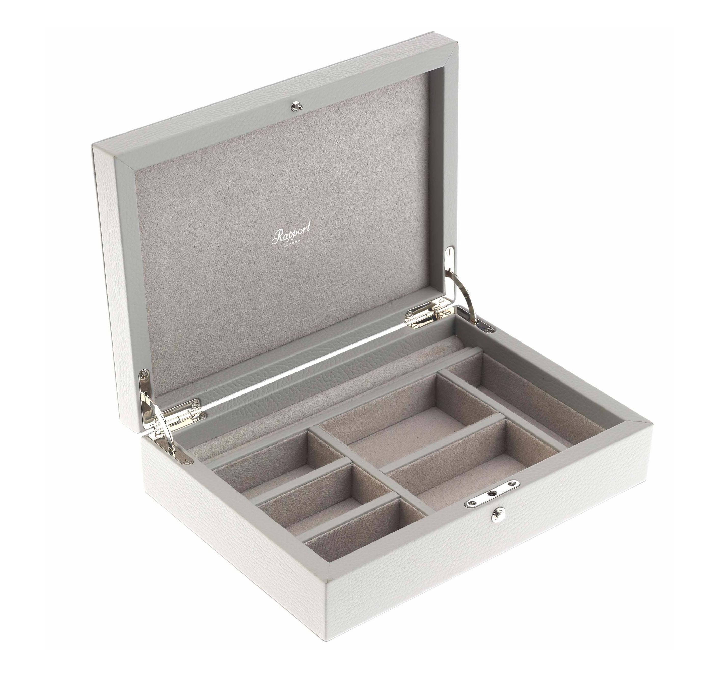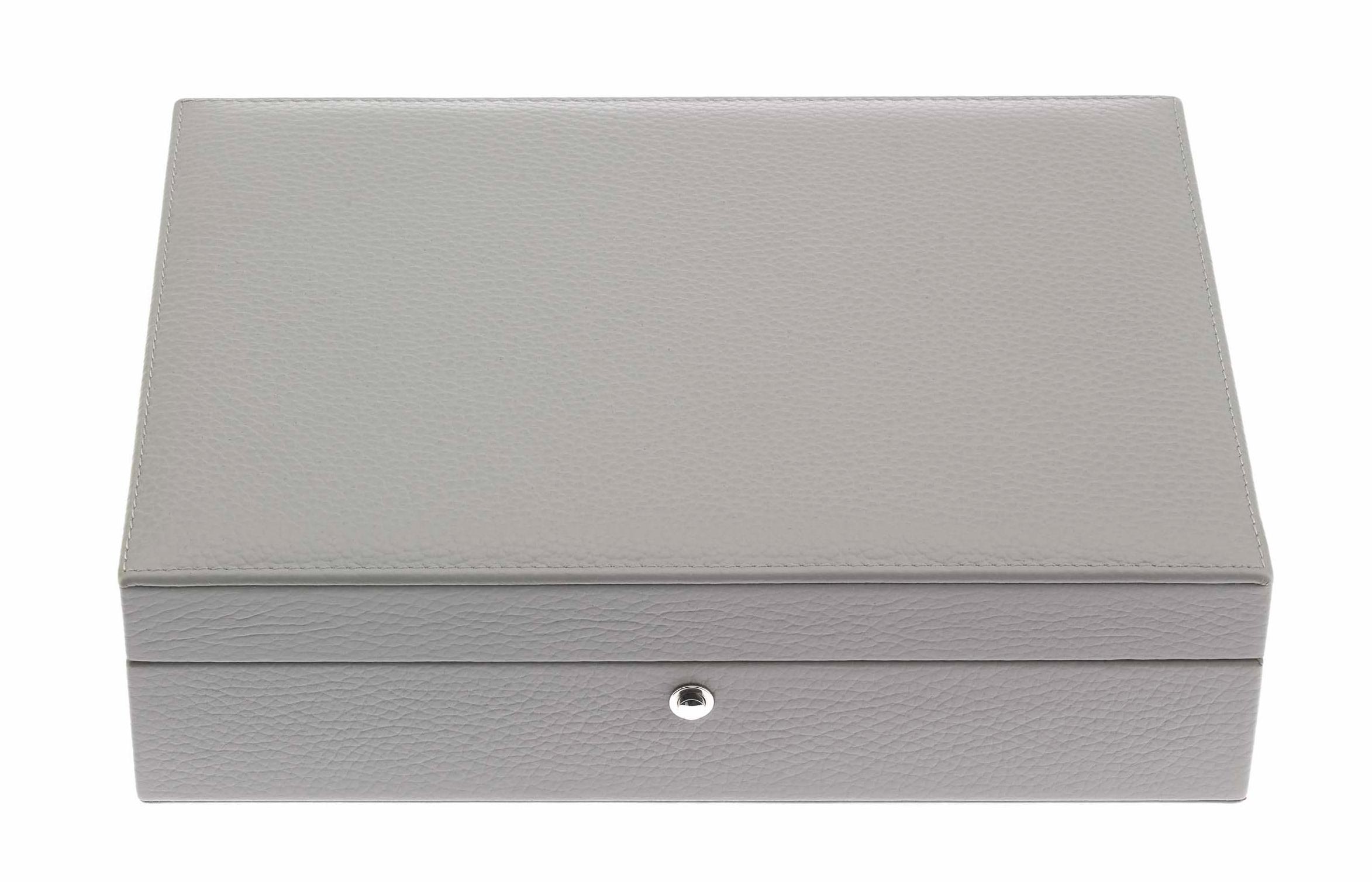 Элегантная шкатулка для ювелирных украшений выполнена из натуральной кожи серого цвета.