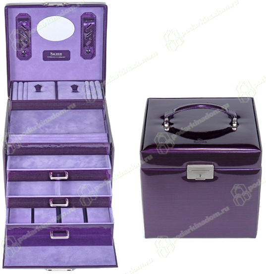 Большая шкатулка верхний ярус которой, автоматически поднимается при открытии шкатулки. Имеет дополнительно три выдижных ящичка,один из которых глубокий и разделен на два глубоких отдела: один под украшения,другой под часы и браслеты.