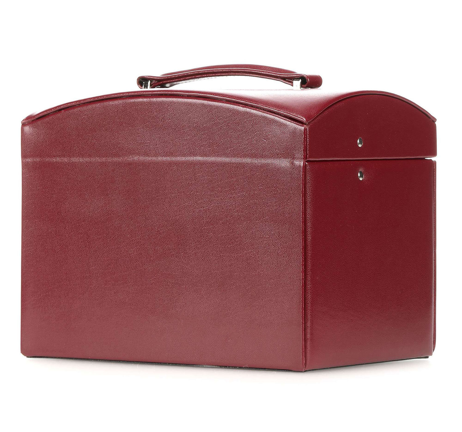 Внутри основное отделение с валиками для колец и отсеками для аксессуаров. 3 выдвижных ящика с отделениями для хранения украшений и аксессуаров. На верхней крышке зеркало и удобное крепление для сережек.