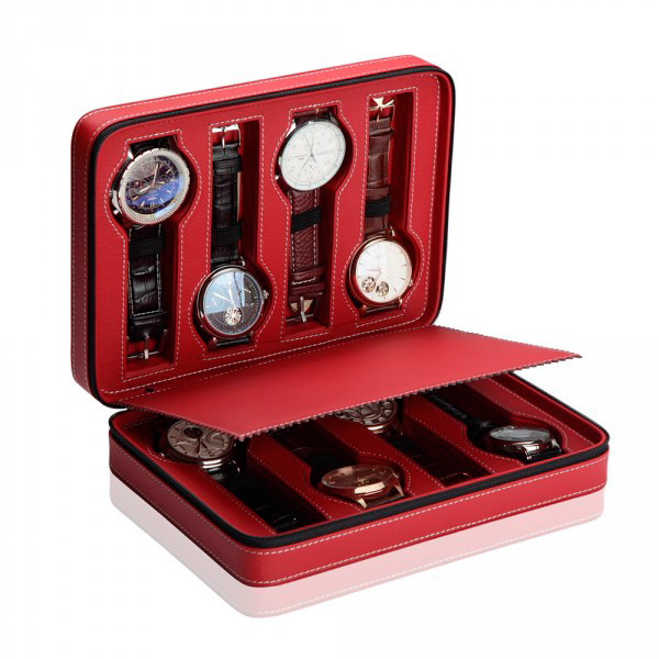 Шкатулка для хранения наручных часов, корпус выполнен из дерева и отделан высококачественной гладкой кожей красного цвета