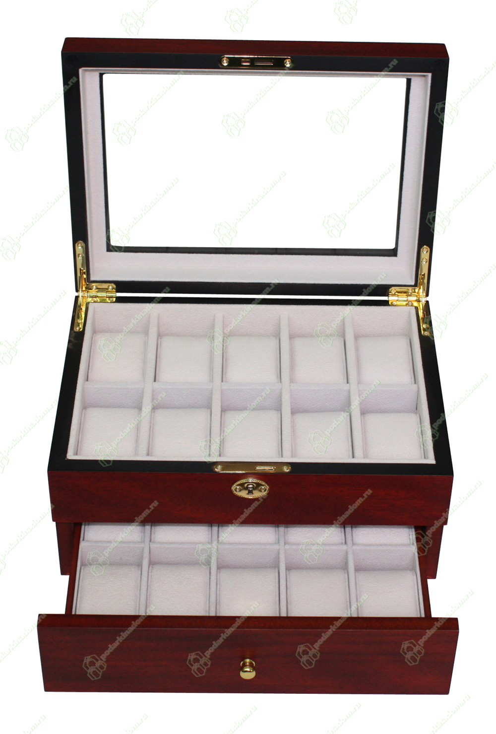 Шкатулка для 20-ти наручных часов с выдвижным ящиком выполнена из натурального дерева