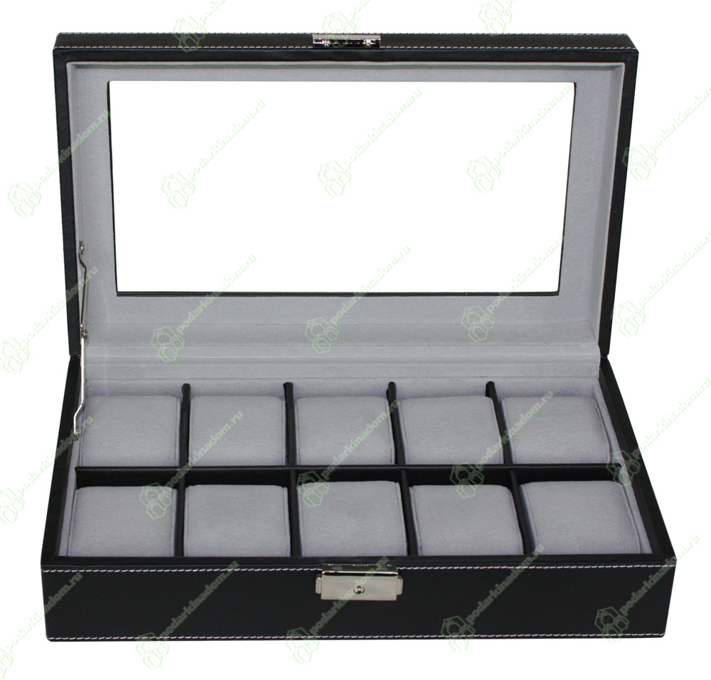 Шкатулка для хранения 10-ти наручных часов выполнена из натурального дерева, обшита кожей.