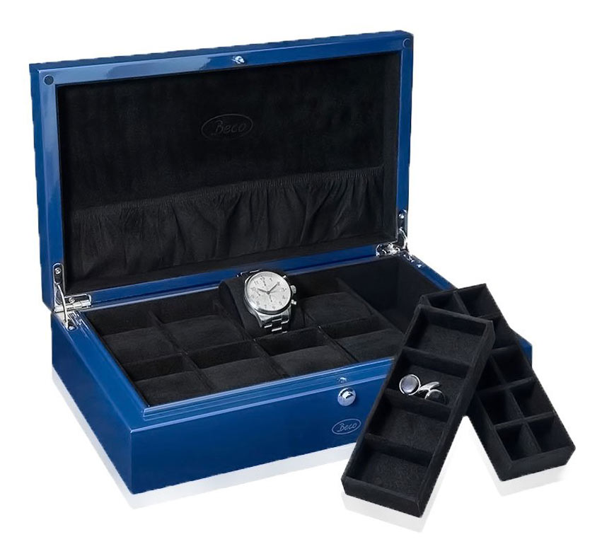 Коробка для хранения 8 часов. Деревянный корпус под синим лаком. Внутрення отделка бархатная ткань черного цвета.