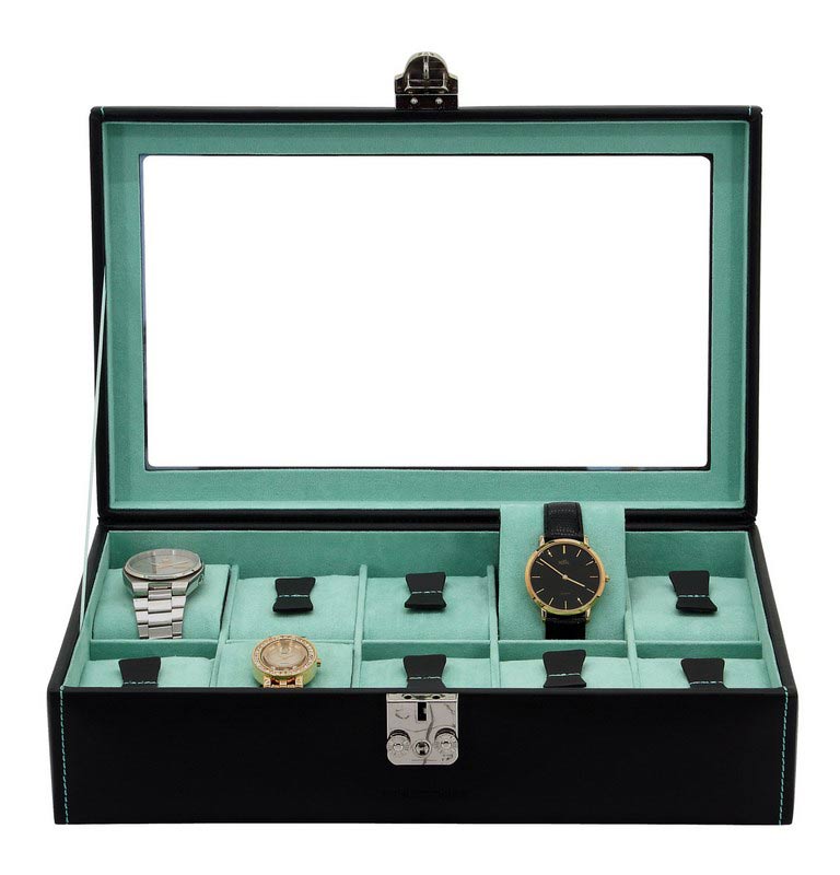 Шкатулка для хранения 10-ти наручных часов из натуральной кожи черного цвета. Внутри отделка выполнена из нежно-бирюзового велюра.
