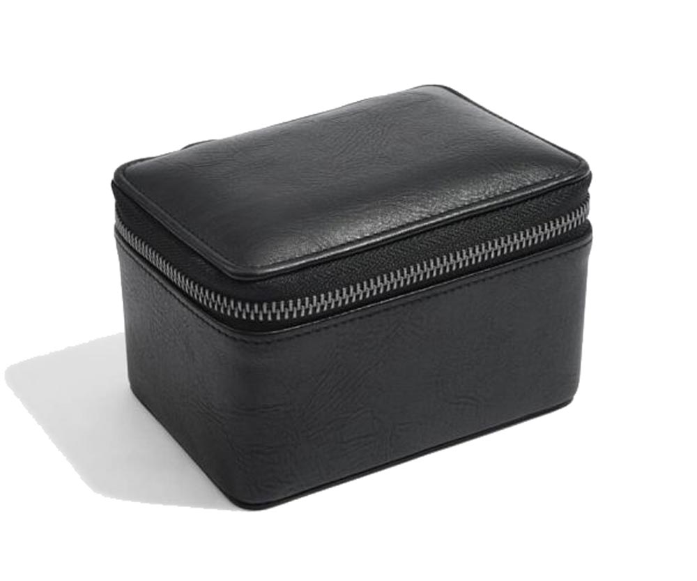 Компактный мужской дорожный футляр из высококачественной фактурной экокожи черного цвета. Внутренняя отделка выполнена из вельвета черного цвета.