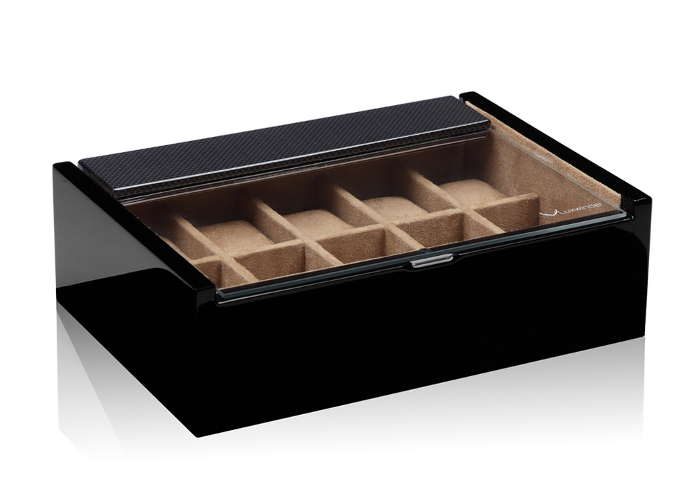 Шкатулка рассчитана для хранения до десяти наручных часов, и для удобства оснащена широким смотровым окном, выполненным из прочного каленого стекла, толщиной 4 мм. В откидной крышке имеется оригинальная вставка из карбона. Нижняя часть шкатулки обита черным бархатом.