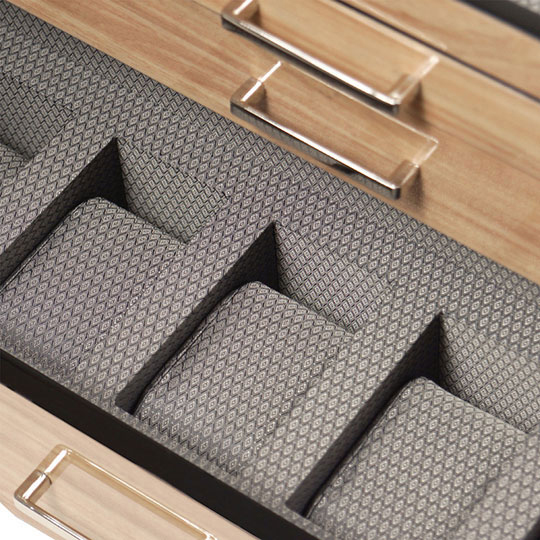 Шкатулка для 5 часов. 3 выдвижных ящика и дополнительное открытое отделение для хранения часов, украшений и аксессуаров.