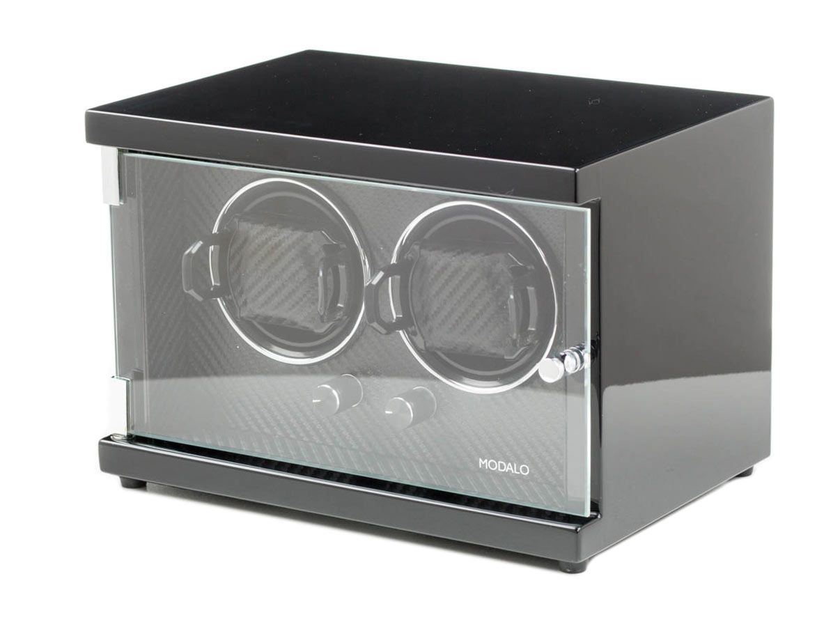 Шкатулка для 2 часов с подзаводом. Глянцевый деревянный корпус, внутренняя отделка карбон. Питание – сеть.