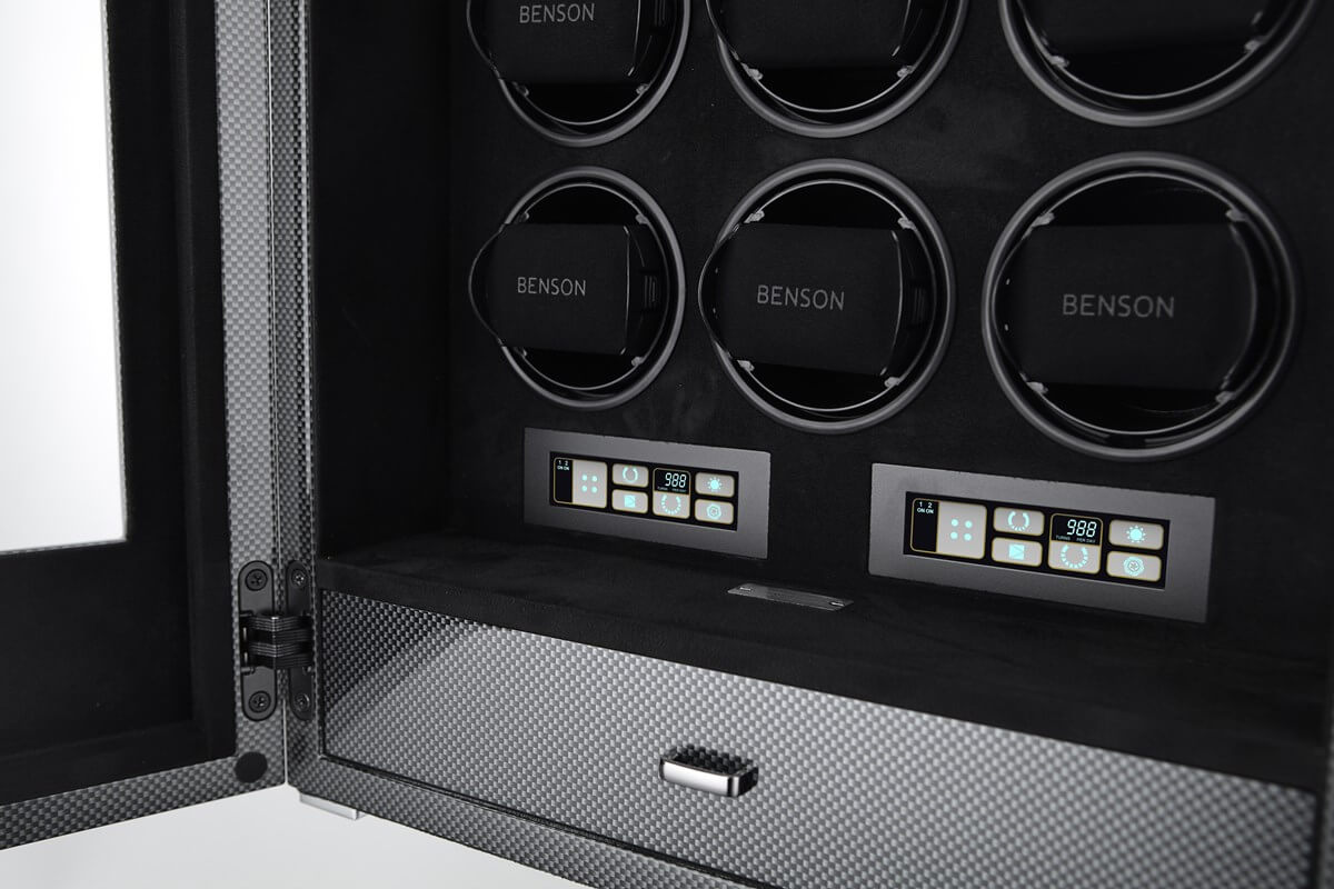 Строгий и лаконичный дизайн позволит дополнить любой интерьер или незаметно вписаться в гардеробной. Корпус выполнен из дерева и покрыт лаком с имитацией карбона.. 12 тихих независимых моторов управляются с помощью сенсорной панели. Светодиодная подсветка. Внутренняя отделка: черный бархат. Внизу шкатулки выдвижной ящик для хранения часов или аксессуаров.