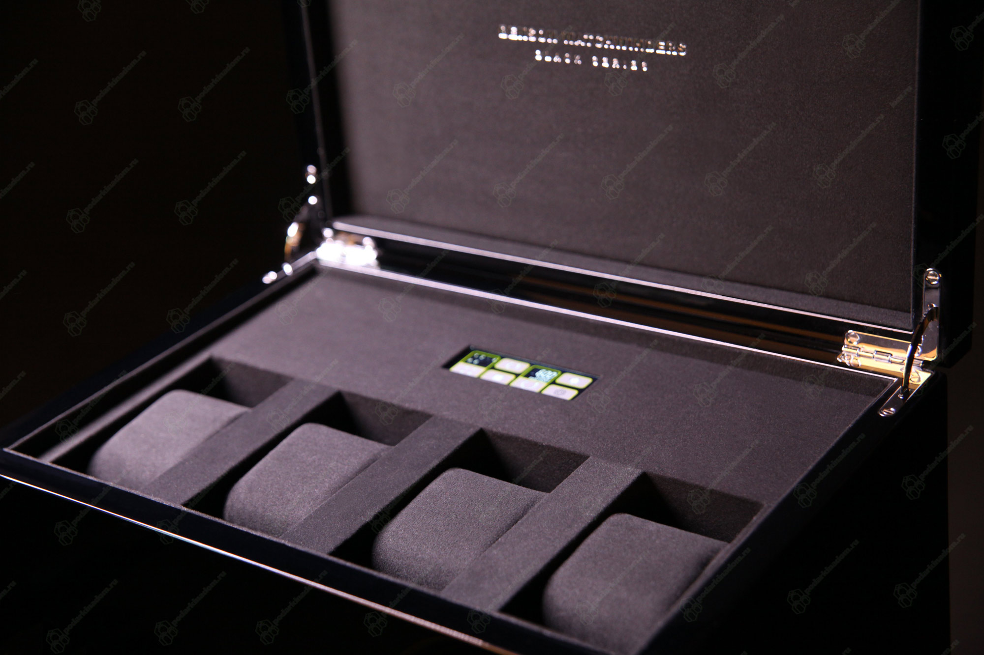 Шкатулка для 6 наручных часов с автоподзаводом и с отделения для хранения 4 часов. Корпус из дерева покрытый черным лаком.