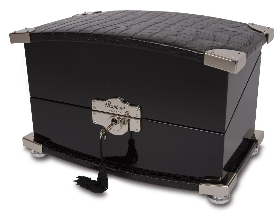 Внешняя отделка черная кожа. Внутренняя отделка - светло-серый вельвет. Эта модель очень надежна и обладает большими функциональными возможностями. В шкатулках фирмы Rapport London установлены специальные механизмы, которые вращают часы под определенным углом. Моторы работают беззвучно. Держатели для часов совершенно безопасны и абсолютно надежны. Имеется три программы направления движения часов: по часовой стрелке, против и смешанный режим. Бокс работает следующим образом: вам нужно установить часы и выбрать нужное направление вращения. Бокс включается и держатель начинает вращать часы. После этого следует перерыв, интервал которого зависит от того, какую именно программу вы выбрали. Затем цикл автоматически повторяется.