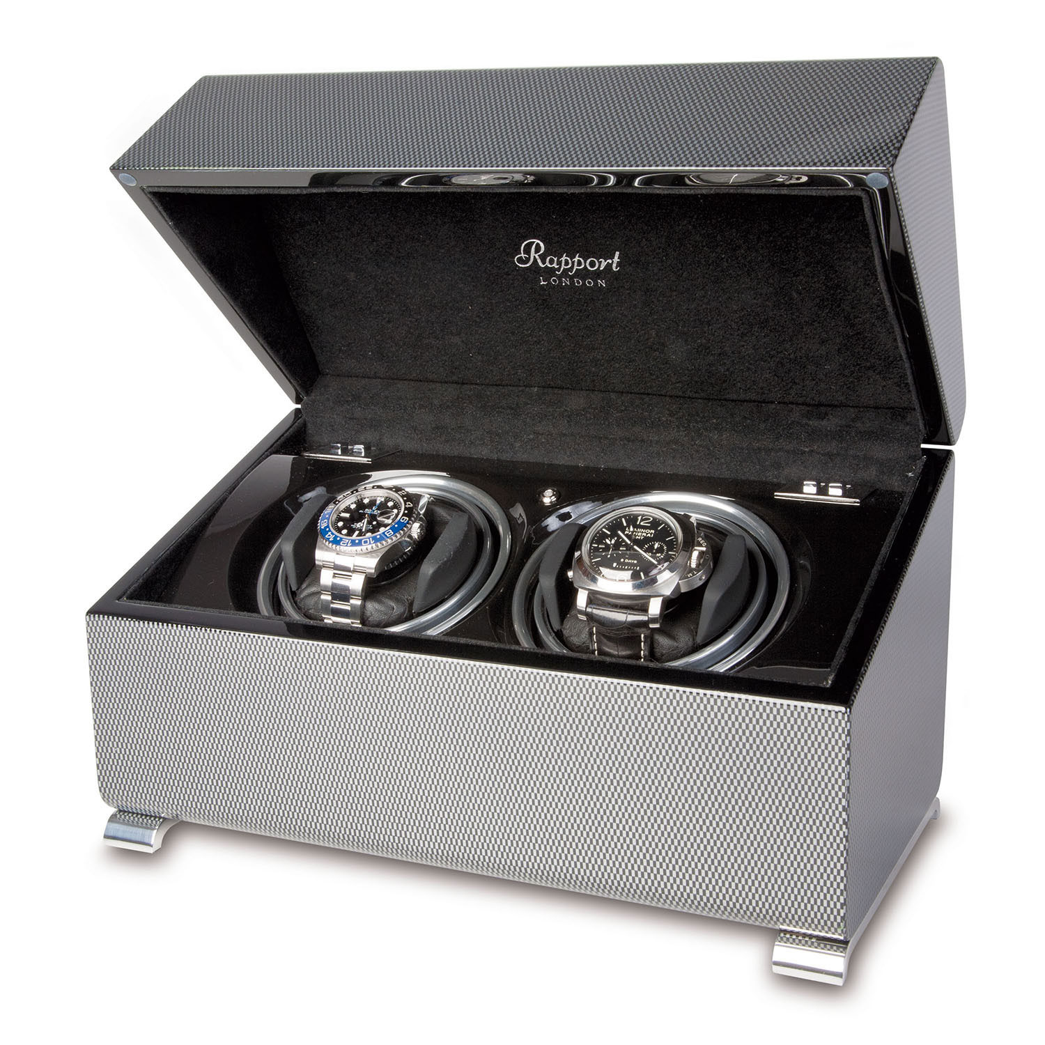 Vogue Duo. Carbon Fibre. Rapport London. Сделано в Великобритании. Эта модель очень надежна и обладает большими функциональными возможностями. В шкатулках фирмы Rapport London установлены специальные механизмы, которые вращают часы под определенным углом. Моторы работают беззвучно. Держатели для часов совершенно безопасны и абсолютно надежны. Имеется три программы направления движения часов: по часовой стрелке, против и смешанный режим. Каждый держатель для часов работает от отдельного мотора, имеет свою регулировку направления вращения, что позволяет хранить в шкатулке часы с разными характеристиками