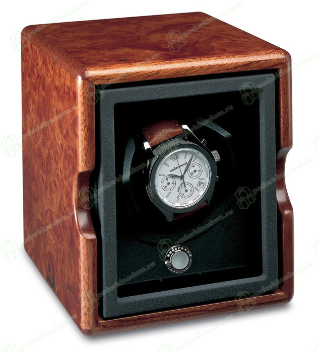 Шкатулка для хранения часов с автоматическим заводом с возможностью легкой транспортировки. • Внешний корпус: карельская береза. • Внешняя отделка-кожаный футляр: варианты цвета - рыжевато-коричневый или черный. • Внутренняя отделка: материал - высокотехнологичный композитный материал; цвет - графитовый. • Скорость вращения около 5 оборотов в минуту. • Уровень шума не более 5dB. Батарейки отключаются, когда модуль работает от сети. • 1 Программа, позволяющие достичь за сутки 90-100% резерва хода: • Программа - 30 минут час по часовой стрелке, 30 минут против часовой стрелки, "отдых" 3 часа. 1800 оборотов в сутки. • Индикатор "конца жизни" батареек. Включается, когда напряжение меньше 2,4V. • Индивидуальный серийный номер. Проверьте необходимое направление вращения для Ваших часов.