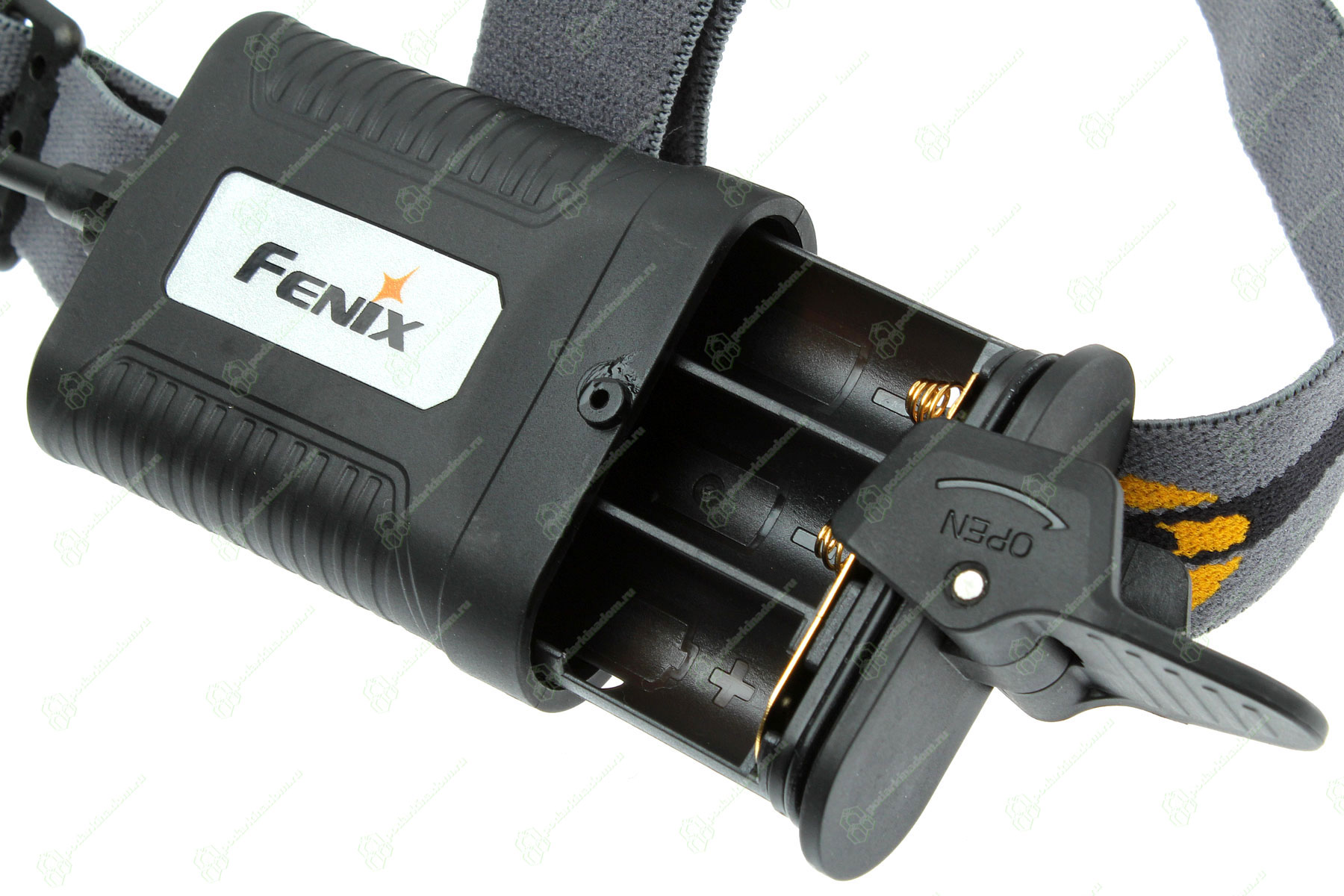Корпус Fenix HP05 изготовлен из алюминиевого сплава, крепление - прочный пластик. Угол наклона можно регулировать в пределах 60 градусов. Мягкое оголовье надежно удерживает фонарь и может сниматься для стирки. Быстросъемный батарейный блок крепится к задней части оголовья и может содержать три щелочные батарейки формата АА или три аккумулятора NiMH. Имеется защита от неправильно установленных батарей.
