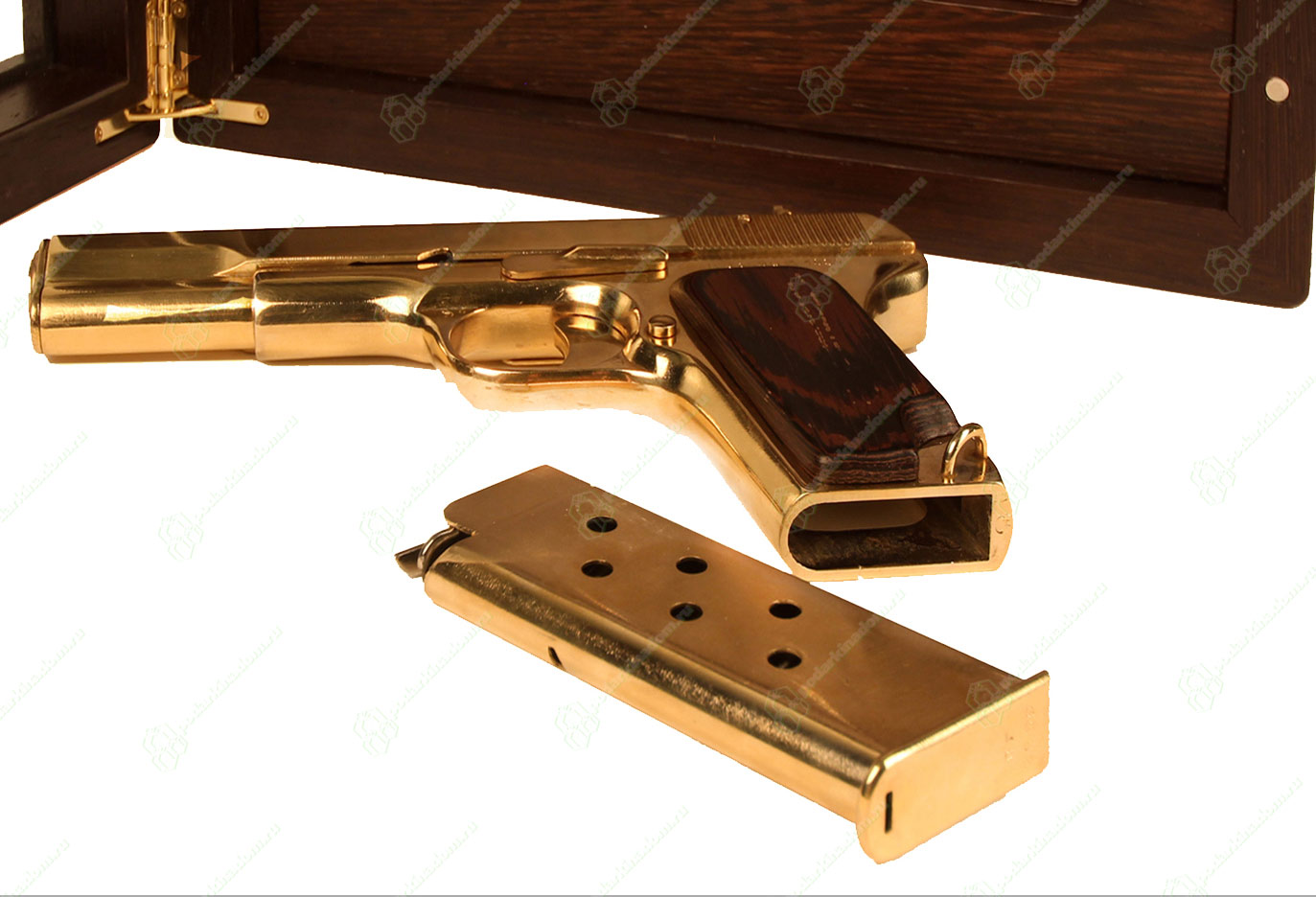 Пистолет полностью покрыты золотом: рама, затвор, обойма, ствол, ударно-спусковой механизм, внутренняя поверхность.