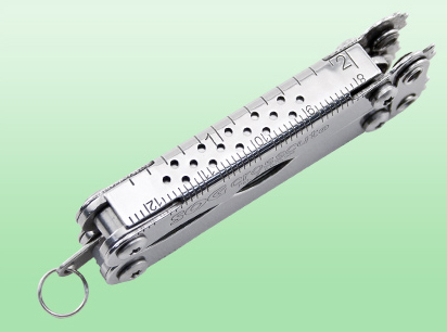 Комплектация: ножницы, лезвие, напильник, отвертка, открывалка для бутылок/миниотвертка, пинцет, зубочистка, линейка, кольцо для шнурка.