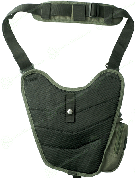 На плечевом ремне помимо быстроразъемного замка фастекс и накладки с вентилируемым слоем, находится металлический карабин, предназначенный для крепления на сумке дополнительного снаряжения и фиксации основного клапана за полукольцо в открытом положении.