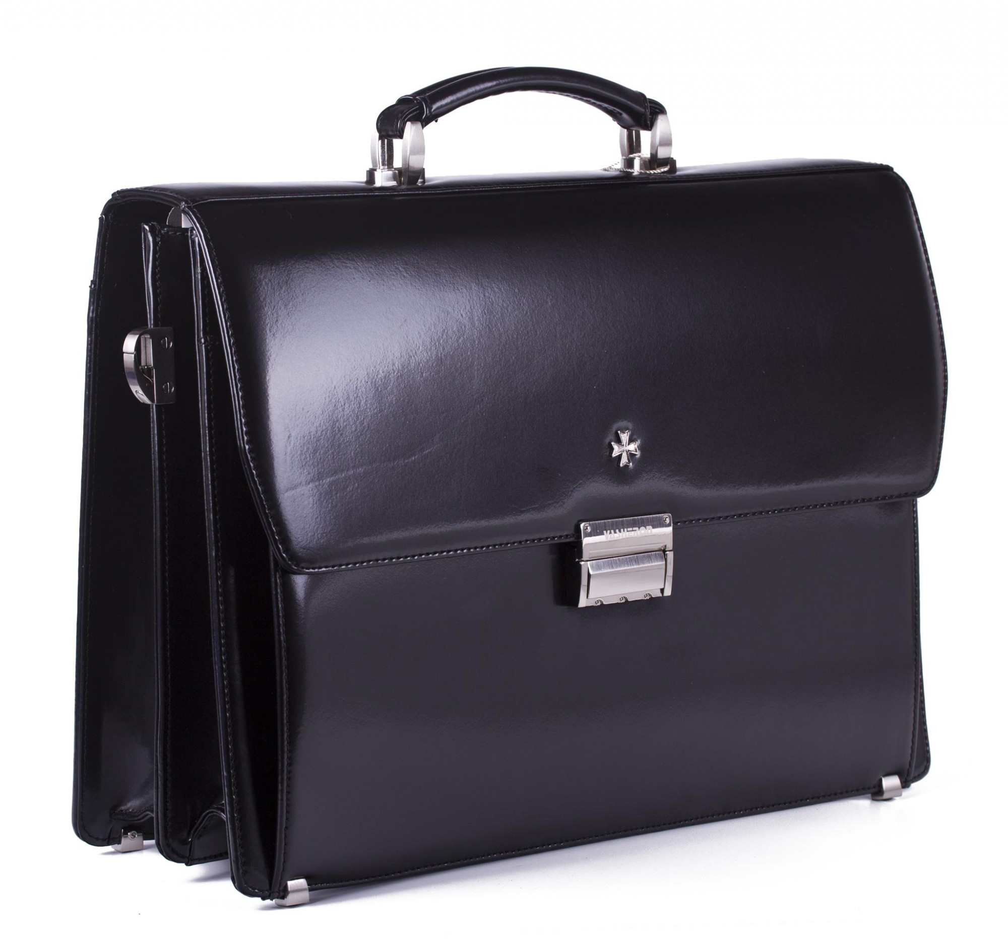 Швейцарский портфель с кодовым замком выполнен из натуральной телячей кожи черного цвета.