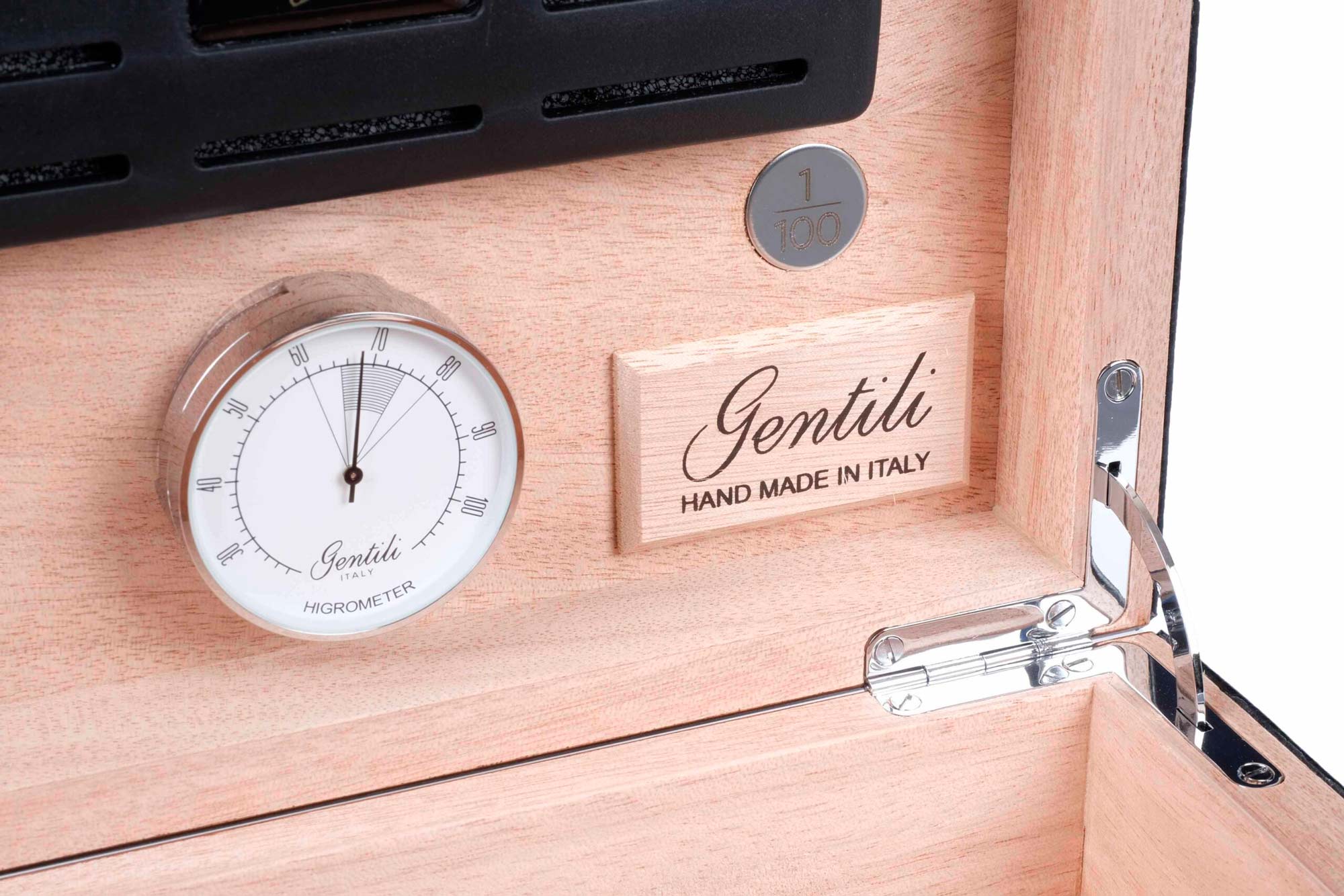 Хьюмидор на 15 сигар лимитированной серии из 100 штук от итальянских мастеров фабрики Fabrizio Gentili SRL. Исполнен в классическом итальянском стиле — элегантное сочетание лучших материалов в единое целое: ценных пород дерева, кожи, металла. Корпус представляет собой комбинацию нескольких видов дерева, что обеспечивает стойкость к деформации при колебаниях температуры и влажности. Внутренняя отделка выполнена из испанского кедра. Снаружи шпон Эбенового дерева из Индонезии, покрытый 7-ю слоями лака, а также натуральная телячья кожа с тиснением и лакировкой. На внутренней стороне крышки — табличка с порядковым номером изделия в серии из 100 шт. В комплекте увлажнитель с акриловым полимером, итальянский гигрометр, фирменный буклет Gentili с информацией о компании и мультиязычной инструкцией по уходу. Подарочная упаковка. Ручная работа, сделано в Италии.