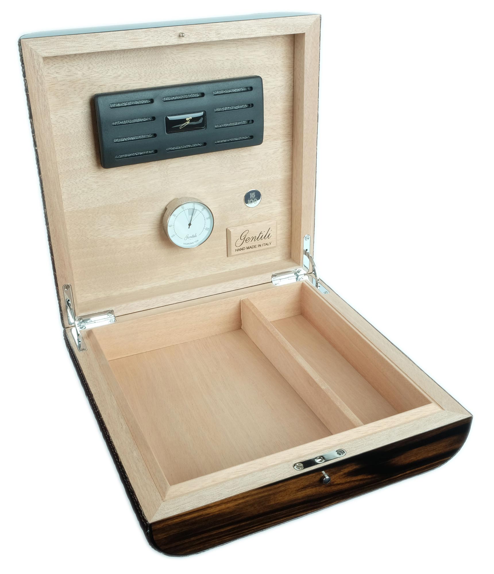 Хьюмидор на 25 сигар лимитированной серии из 100 штук от итальянских мастеров фабрики Fabrizio Gentili SRL. Исполнен в классическом итальянском стиле — элегантное сочетание лучших материалов в единое целое: ценных пород дерева, кожи, металла. Корпус представляет собой комбинацию нескольких видов дерева, что обеспечивает стойкость к деформации при колебаниях температуры и влажности. Внутренняя отделка выполнена из испанского кедра. Снаружи — шпон Эбенового дерева из Индонезии, покрытый 7-ю слоями лака, а также натуральная телячья кожа с тиснением и лакировкой. На внутренней стороне крышки — табличка с порядковым номером изделия в серии из 100 шт. Ручная работа, сделано в Италии. В комплекте увлажнитель с акриловым полимером, итальянский гигрометр.