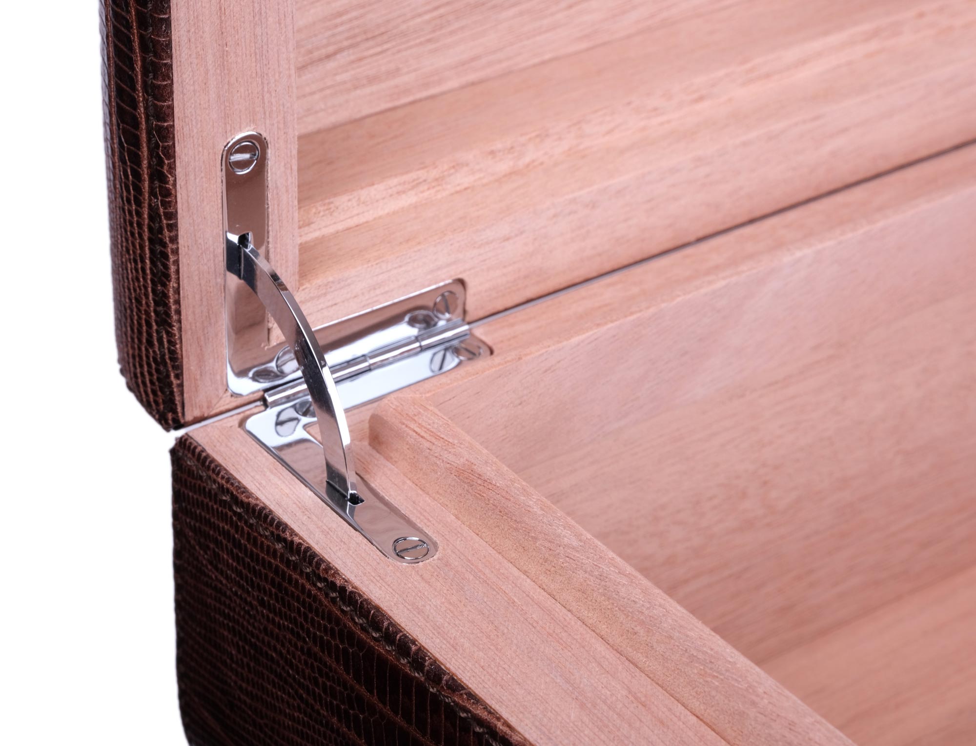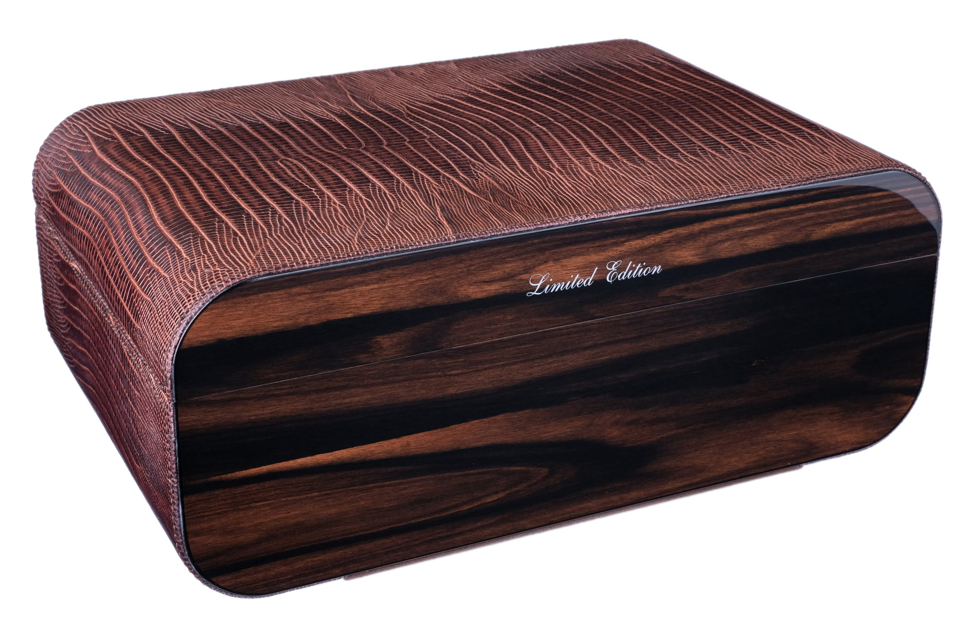 Корпус выполнен из испанского кедра. Снаружи шпон эбенового дерева (Макассар) и натуральная лакированная телячья кожа с тиснением игуана.