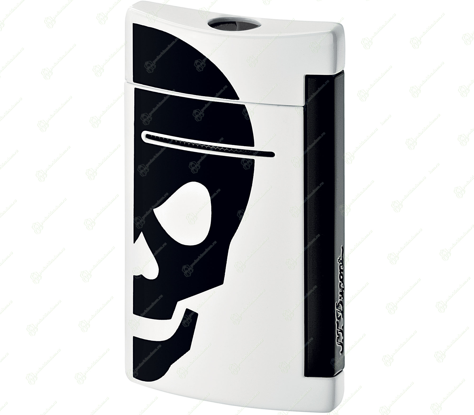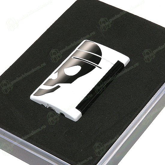 Белая с черным лакированная зажигалка с изображением черепа. Зажигалка оснащена мощным турбо пламенем и окошком для контроля уровня топлива