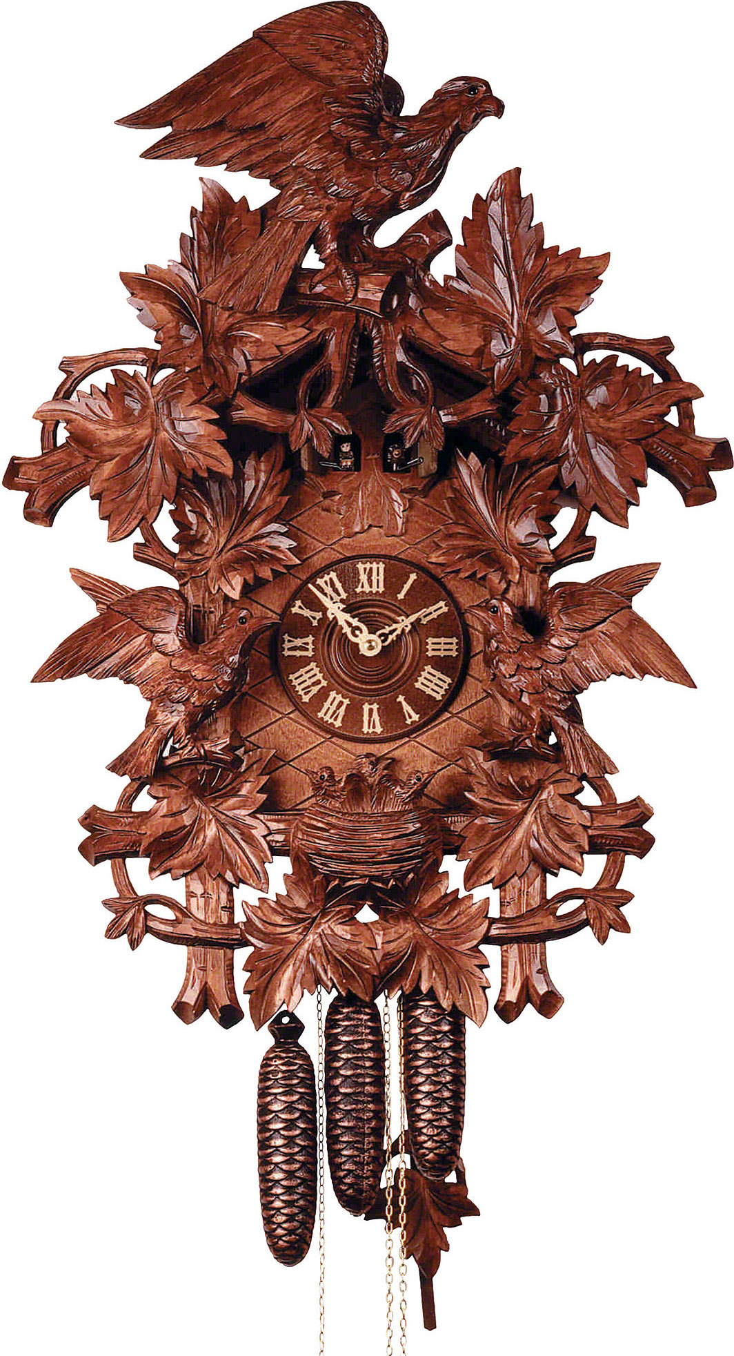 Механические музыкальные часы с кукушкой и двумя дверцами. Ручная работа. Запас хода — 8 дней. Такие часы производят с 1870 года.Они оборудованны музыкальным вальцем с двойным проигрыванием. Часы высшего качества. Морёное дерево, филигранная резьба на тему охоты.