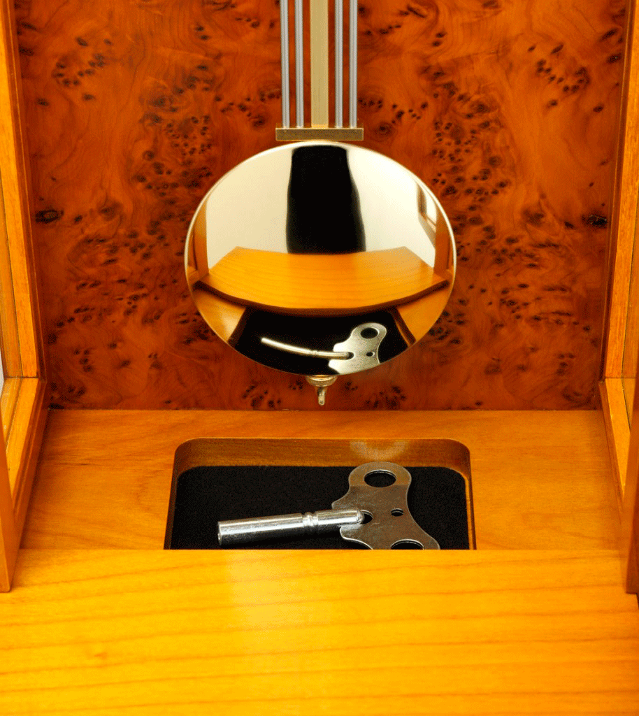 Традиционные английские настенные часы в викторианском стиле. Корпус из массива дерева с отделкой тисовым шпоном украшен резными деталями. Маятниковый механизм с ручным заводом, почасовой бой, 3 мелодии.