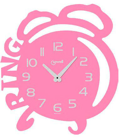 Яркие настенные часы в металлическом корпусе формы будильника.