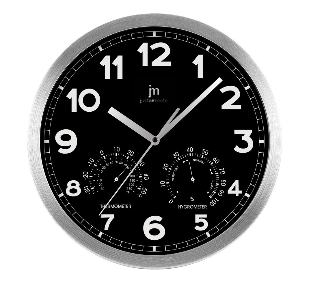 Металлические настенные часы с бесшумным механизмом, термометром и гигрометром. Корпус выполнен из стекла и металла. Циферблат черного цвета. Размеры: диаметр 30 см