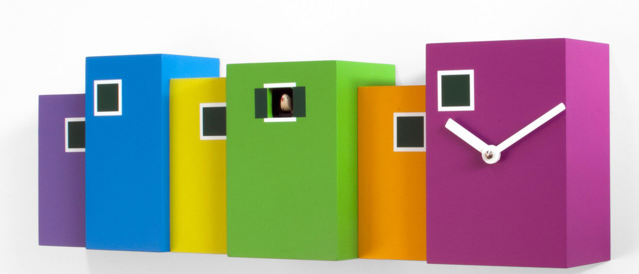 Материал - окрашенная древесина. Цвета: розово-сиреневый, желто-оранжевый, зеленый, голубой. Кварцевый механизм с батарейкой. Имеется встроенный сенсор ночного режима, автоматически отключающий "кукушку"; контролируется световым датчиком. Размеры, см: 16х50х16.