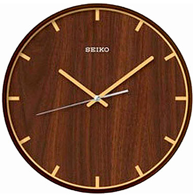 Настенные часы коричневого цвета в круглом пластиковом корпусе с секундной стрелкой, вместо цифр риски желтого цвета.