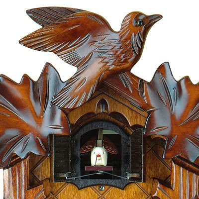 Часы выполнены из дерева в форме домика и декорированы резной птицей и листьями.