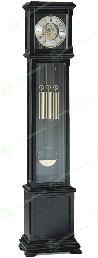 Механические напольные часы в элегантном черном полированном корпусе со стеклянной дверцей и боковыми стенками.