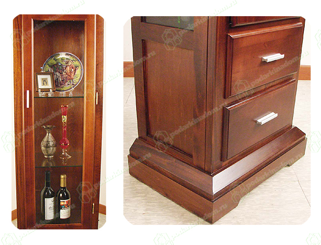 В отличии от традиционных напольных часов, в этой модели во внутренней части нет маятника и гирь, вместо этого есть стеклянные полочки.