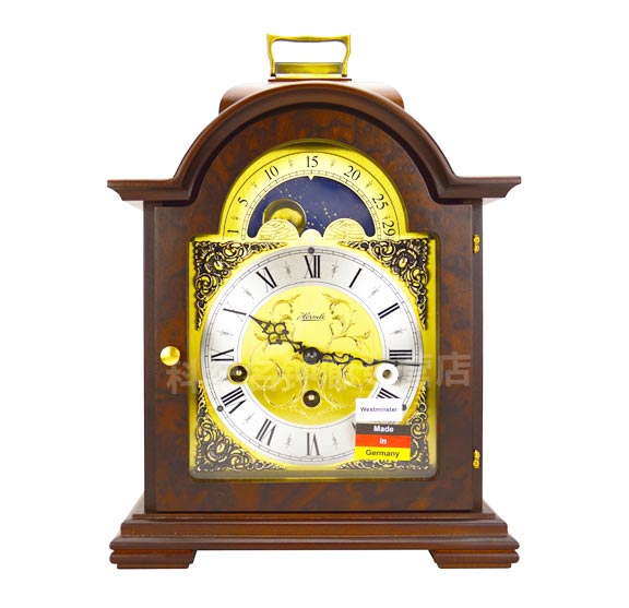 Каминные механические часы. Корпус инкрустированный корнем ореха. Лунный календарь. Боковины со стеклянными окнами, через которые видна работа механизма.