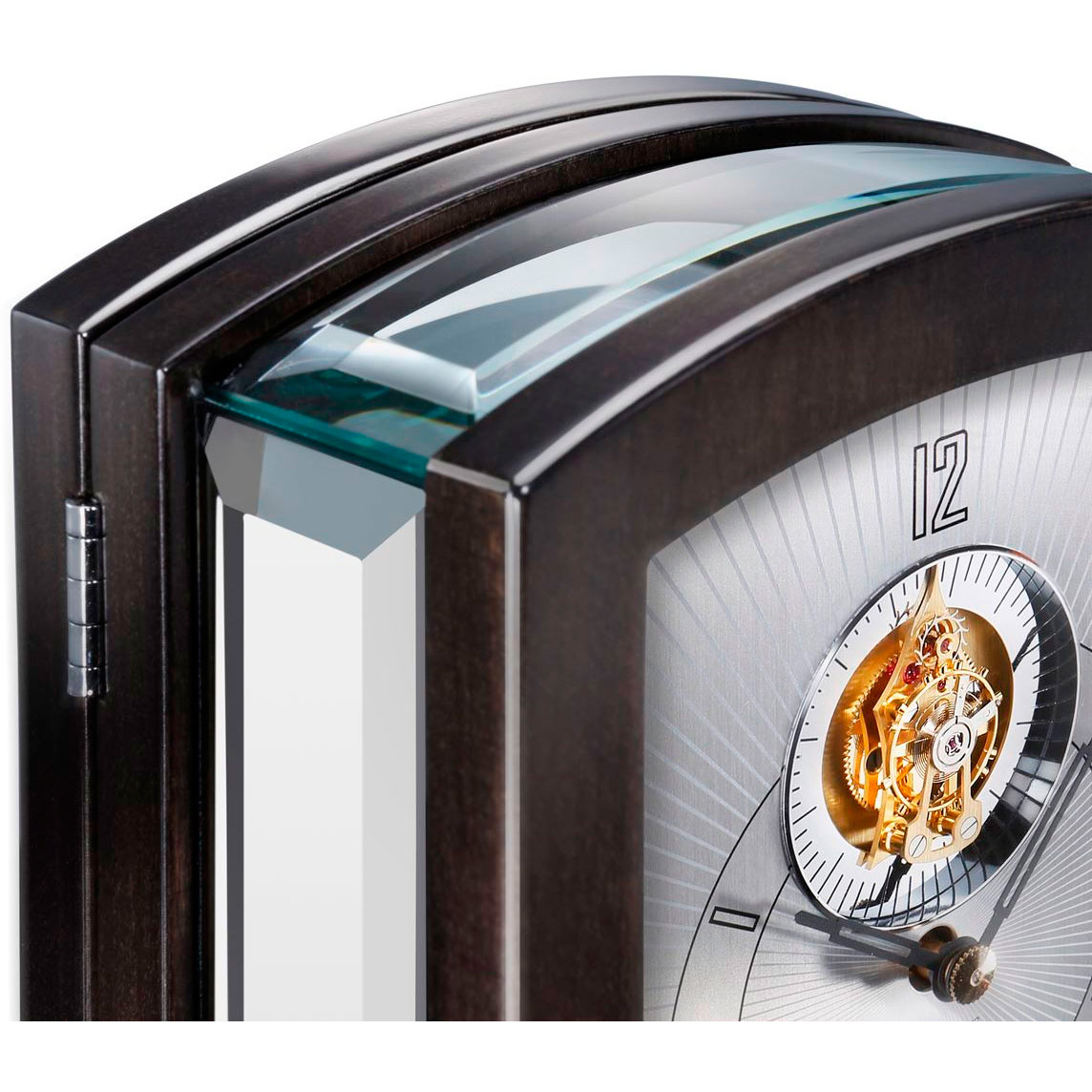 Часы с турбийоном. 8-дневный запас хода. Корпус выполнен из массива тисового дерева со вставками из минерального стекла, многослойное покрытие рояльным лаком.