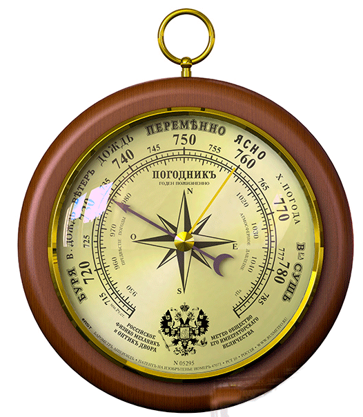 Барометр «Морской» компании RST Sweden, с высокоточным механизмом барометра-анероида собранным в ручную. Механизм прошел проверку на всех этапах сборки и тщательную калибровку. Поэтому допустимая погрешность не превышвет +/- 0.38 mmHg