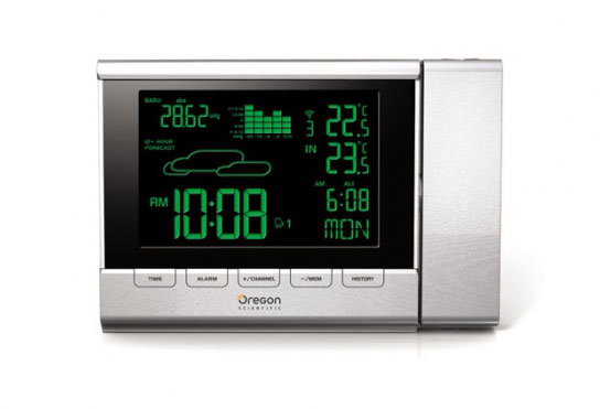 Модель определяет температуру и атмосферное давление, а также оборудована встроенными часами и календарем. В комплект входит датчик, который можно расположить на улице, а сам корпус в любом удобном месте.