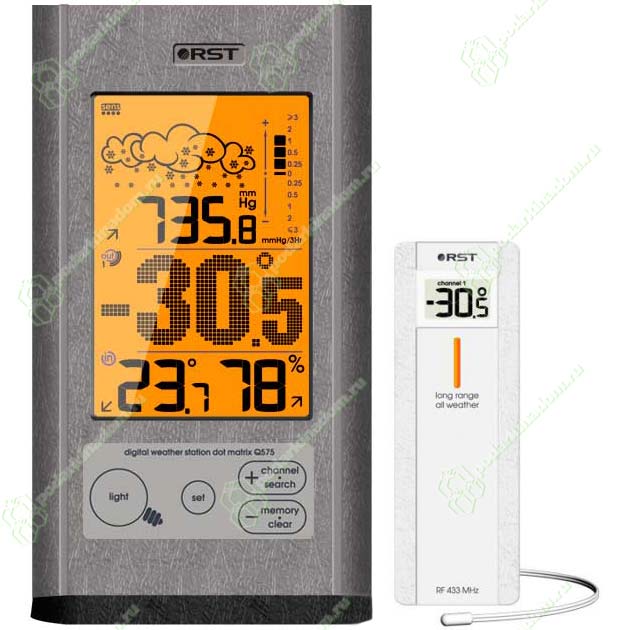 Модель RST 02575 относится к многофункциональным барометрическим станциям, которые осуществляют точный сбор температурных данных, а минимальные и максимальные значения сохраняют, но только за период текущих суток. Для удобства использования устройства разработан качественный и контрастный жидкокристаллический дисплей, который имеет внушительные размеры. Благодаря дисплею, можно контролировать работу оборудования и просматривать сохраненные показания. Имеется интуитивно понятные анимированные символы, которые дают возможность моментально сориентироваться о сложившихся погодных условиях.